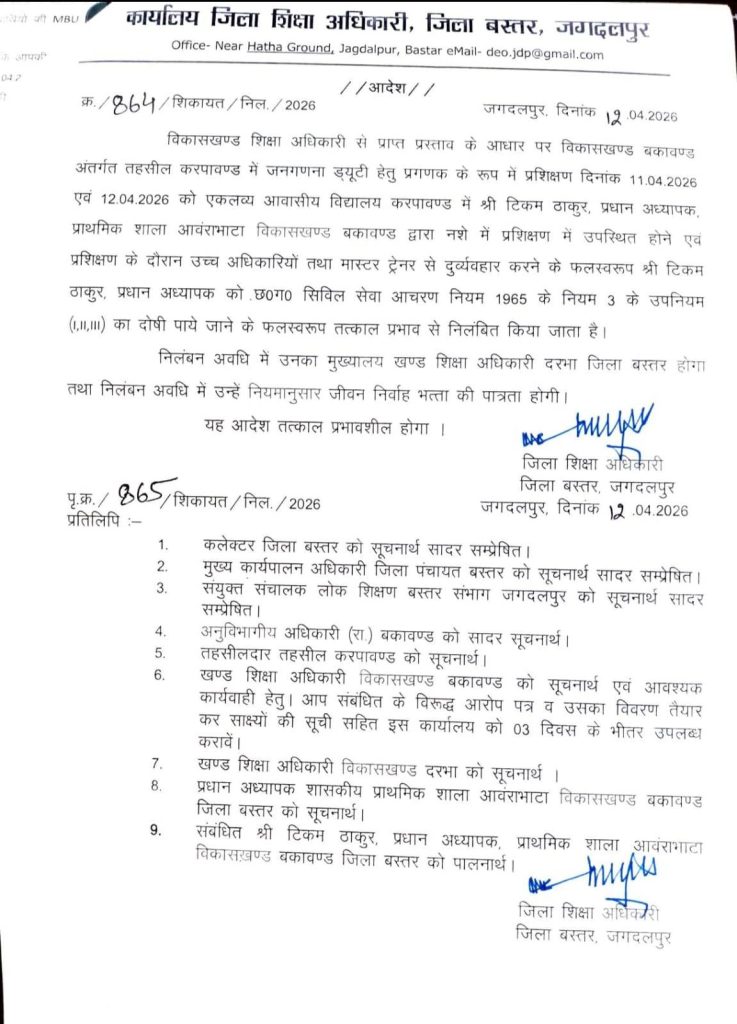 जानकारी के मुताबिक, बकावंड ब्लॉक में जनगणना प्रशिक्षण का आयोजन किया गया था। प्राथमिक शाला आंवराभाटा में पदस्थ हेड मास्टर टीकम कश्यप प्रशिक्षण में शराब पीकर पंहुचा था। आरोप है कि इस दौरान हेडमास्टर ने अधिकारियों और मास्टर टेनर्स के साथ दुर्व्यवहार भी किया। कलेक्टर के आदेश पर जिला शिक्षा अधिकारी ने हेड मास्टर टीकम कश्यप को निलंबित करते हुए दरभा खंड शिक्षा अधिकारी कार्यालय में अटैच कर दिया है।