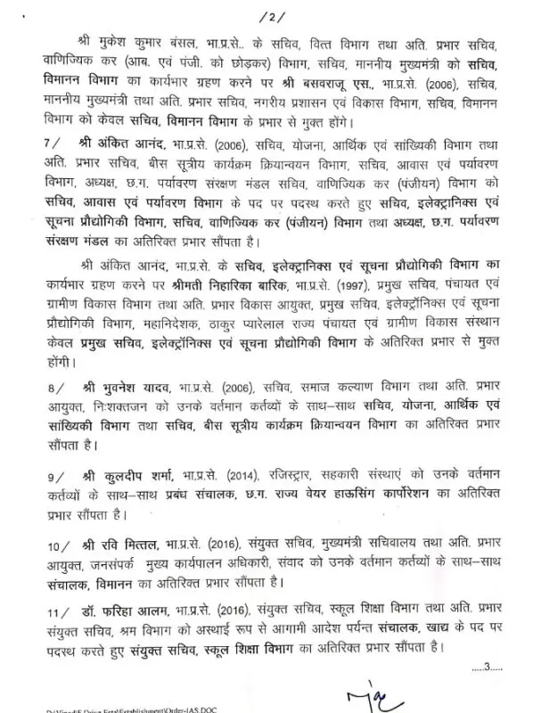 रायपुर। छत्तीसगढ़ प्रशासन में बड़ा आईएएस ट्रांसफर और फेरबदल हुआ है। वरिष्ठ आईएएस अफसरों की जिम्मेदारियों में बदलाव किया गया है। इस फेरबदल के तहत कुल 14 आईएएस अफसर प्रभावित हुए हैं।