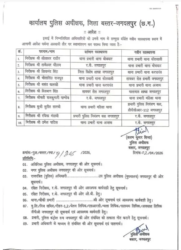 जगदलपुर। बस्तर जिले में प्रशासनिक कसावट लाने के उद्देश्य से पुलिस विभाग में तबादलों का सिलसिला जारी है। पुलिस अधीक्षक कार्यालय द्वारा जारी नवीनतम आदेश के अनुसार, जिले के 10 निरीक्षकों को इधर से उधर किया गया है। इस फेरबदल में सबसे महत्वपूर्ण बदलाव थाना प्रभारियों के स्तर पर देखा गया है, जहाँ 5 प्रमुख थानों की कमान बदली गई है।