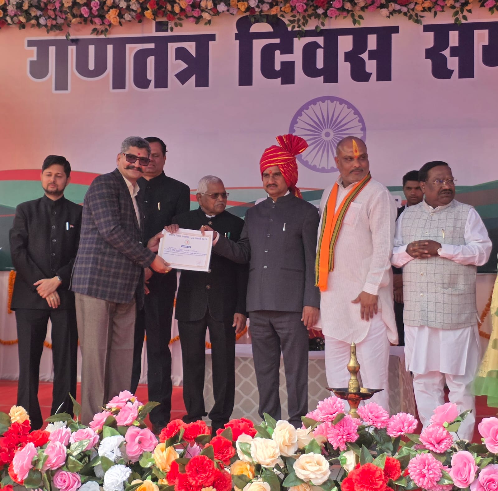 दुर्ग। गणतंत्र दिवस के पावन अवसर पर पंडित रविशंकर स्टेडियम, दुर्ग में आयोजित जिला स्तरीय मुख्य समारोह में कल्याणी सोशल वेलफेयर एंड रिसर्च आर्गेनाईजेशन के निदेशक अजय कल्याणी को उनकी उत्कृष्ट सेवाओं के लिए सम्मानित किया गया।
