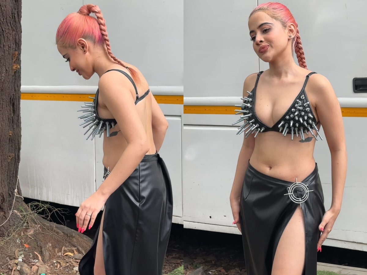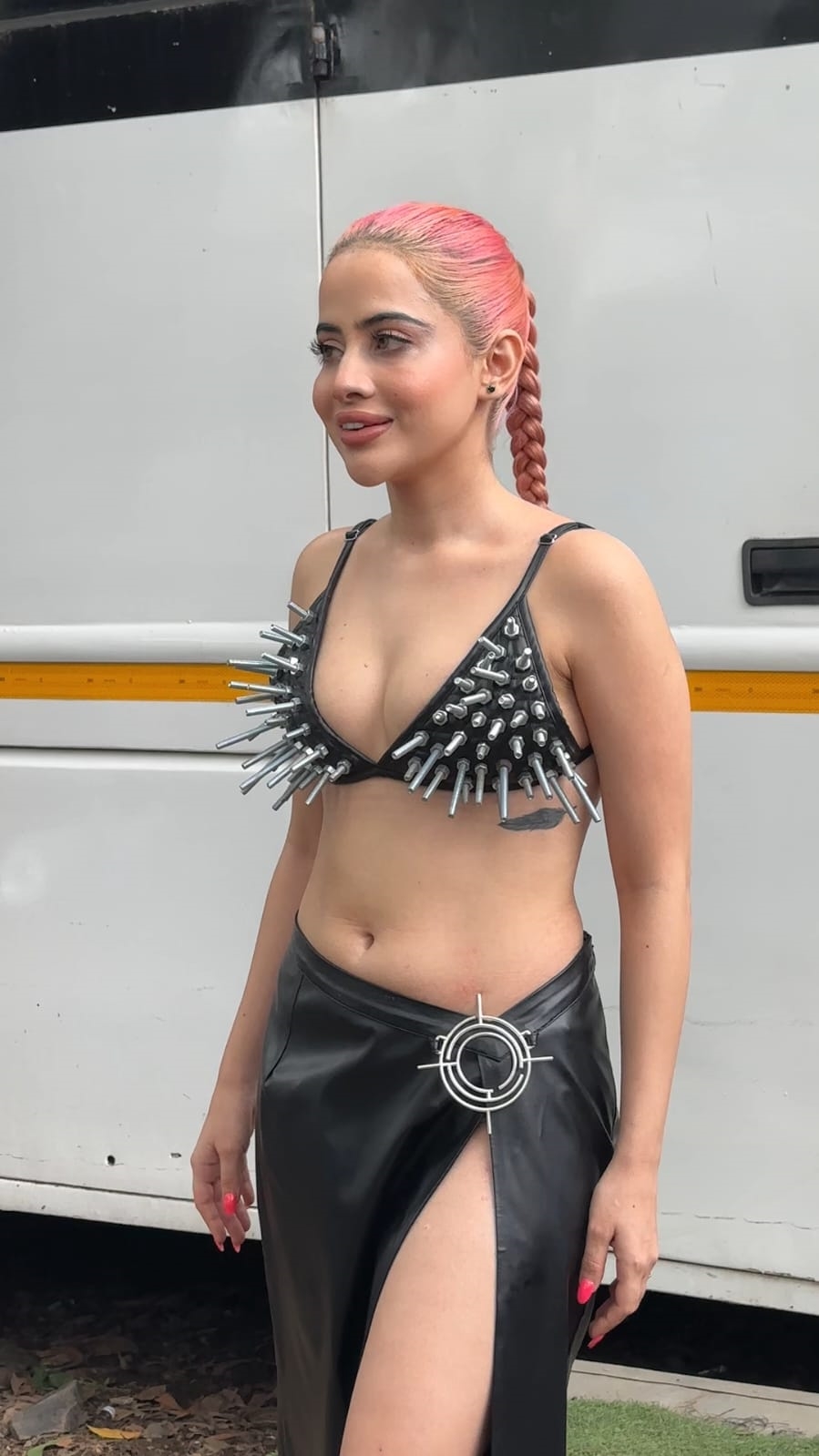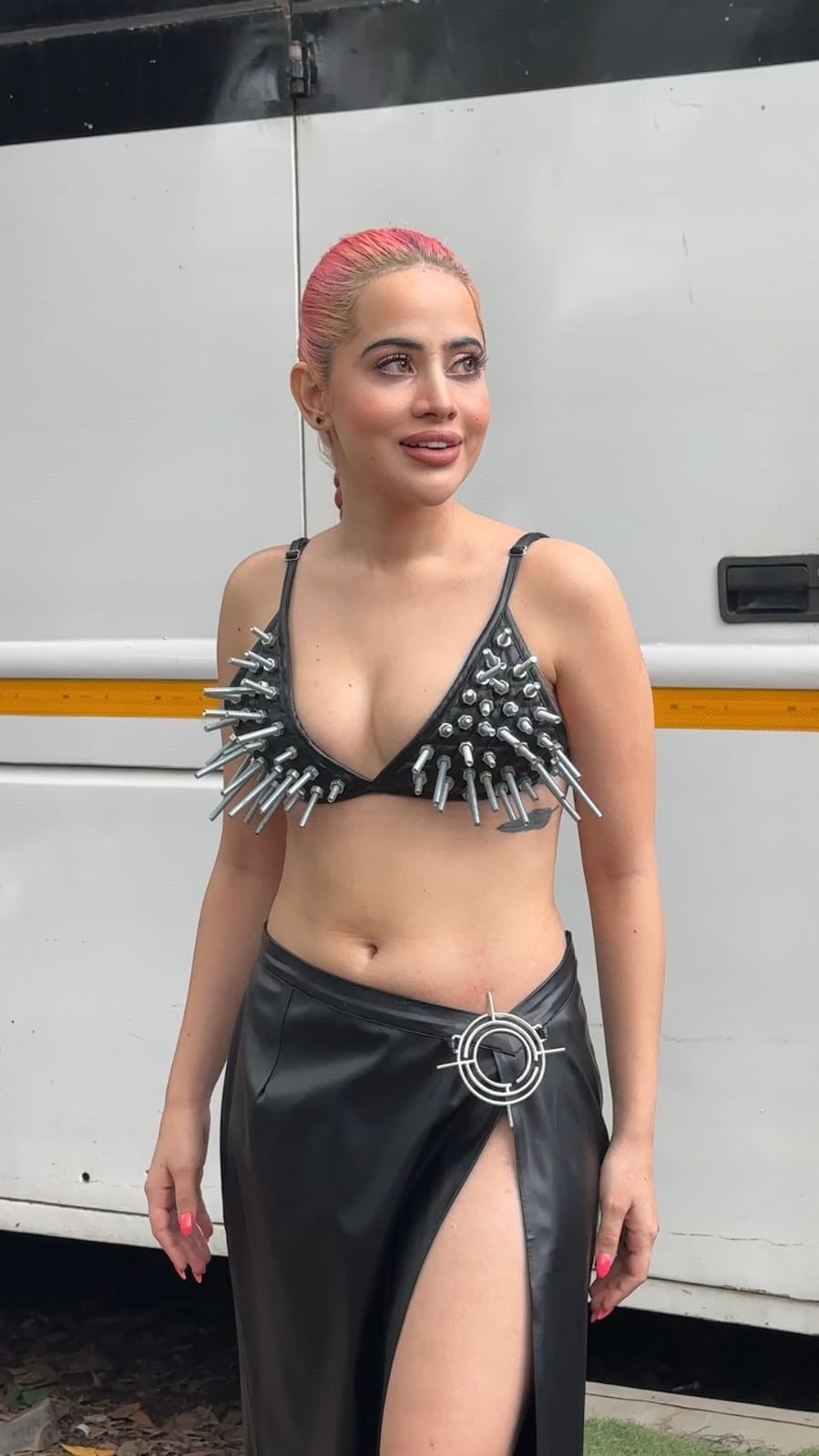उर्फी जावेद इस बार एक अलग ही लेवल की खतरनाक ड्रेस पहने नजर आई हैं. उर्फी ने नई ड्रेस का ब्रालेट स्टाइल ब्लाउज ब्लैक लैदर पर स्क्रू फिक्स करके बनाया है. उर्फी ने अपने ब्लाउज पर छोटे-बड़े हर किस्म के स्कू लगाए हैं.