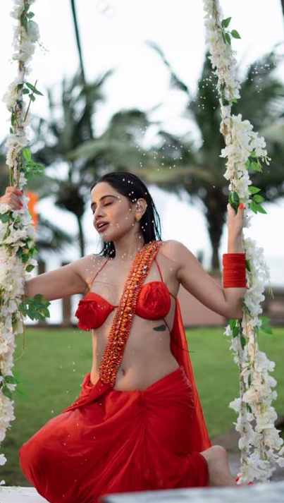 यहां उर्फी ने लाल रंग साड़ी और बेहद ही अतरंगी और बोल्ड ब्लाउज पहन झूले पर सेंसुशस अंदाज में पोज देती दिखाई दे रही हैं.